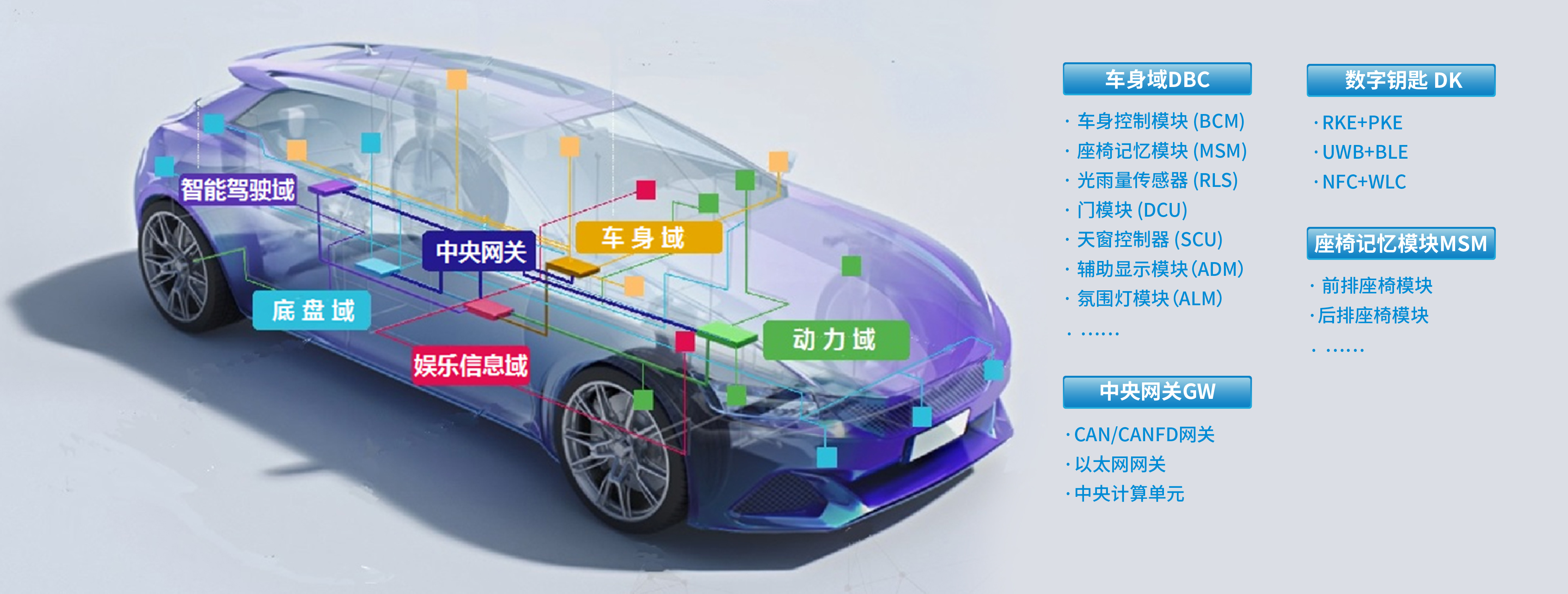 车身电子业务方面,fb体育自2015年布局智能汽车,在软硬件方面均有所积淀,可为客户提供性价比的车身域控制器(BCM/BGM)、网关模块(GW)、数字钥匙(DK)、座椅记忆模块(MSM)等产品。