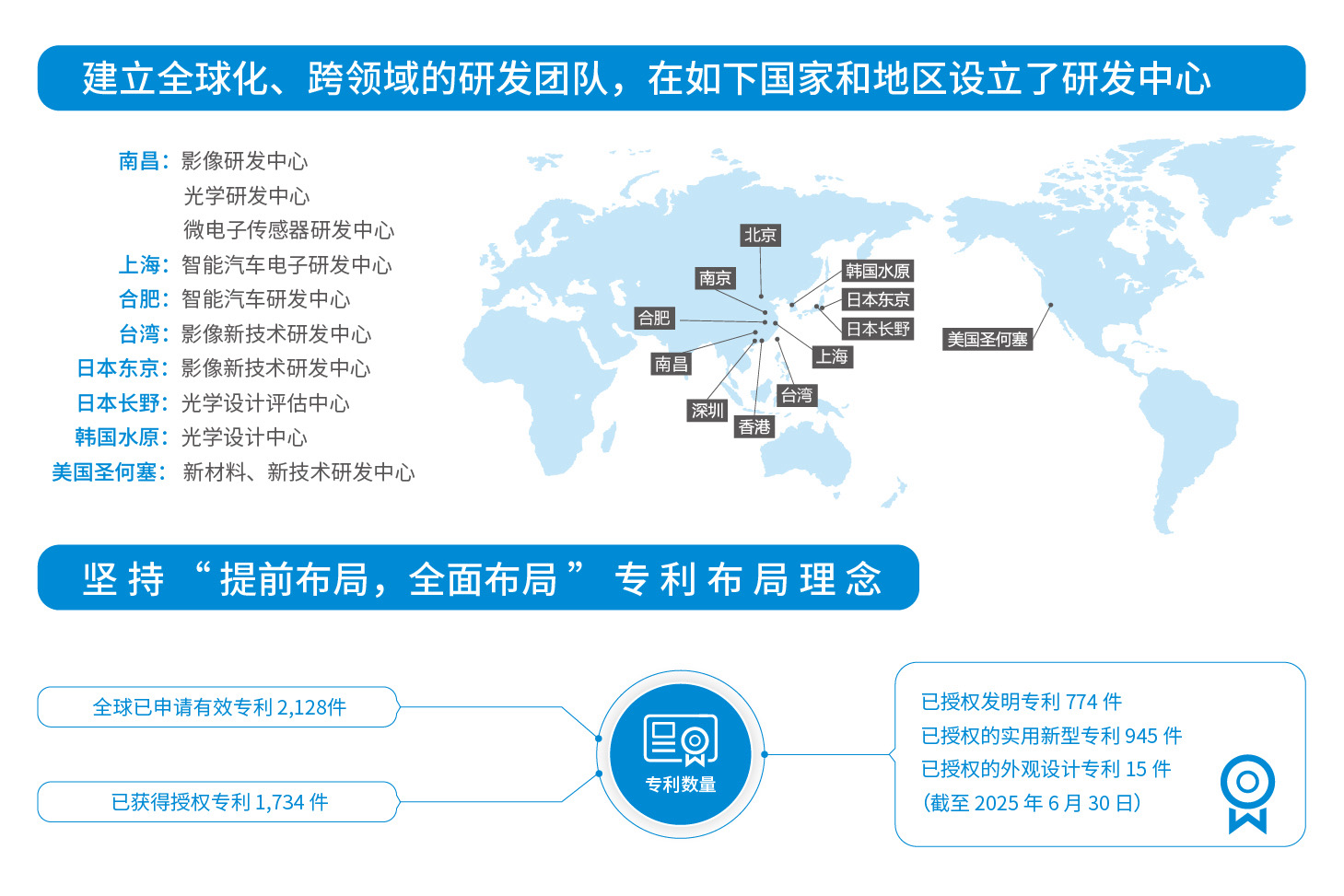 “提前布局,全面布局”是fb体育专利的布局理念,布局领域涉及智能手机、智能汽车和新领域等。 截至 2025 年 6 月 30 日,公司在全球已申请有效专利 2,128件,已获得授权专利 1,734 件。其中,授权发明专利 774 件,已授权的实用新型专利 945 件,已授权的外观设计专利 15 件。